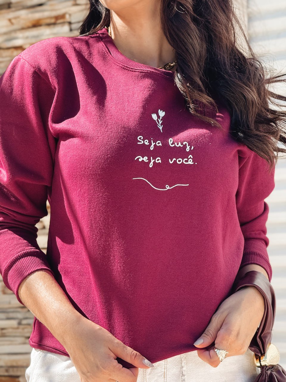 Confeccionado em moletom de alta qualidade na vibrante cor bordô (ou vinho), este pulôver oferece um toque macio e super agradável na pele, perfeito para os dias mais frescos. O grande destaque é a frase inspiradora “Seja luz, seja você.” em branco, com detalhes delicados de flores, que adiciona um toque de poesia e positividade ao seu visual. O corte clássico com gola redonda e mangas longas garante um caimento confortável e versátil para diversas ocasiões.