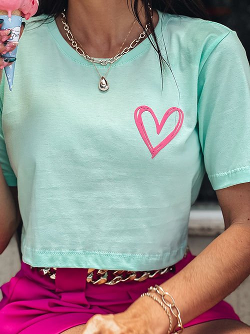 O destaque fica por conta do coração estampado em tom rosa vibrante no lado esquerdo do peito, que transmite um visual jovem, romântico e cheio de personalidade. A cor verde menta traz frescor e combina perfeitamente com peças coloridas ou neutras.