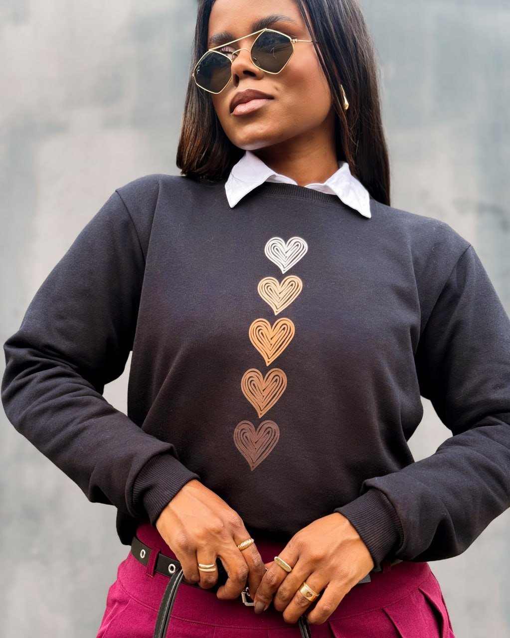 Confeccionado em moletom de alta qualidade, este pulôver preto clássico oferece um toque macio e super agradável na pele, perfeito para os dias mais frescos. O grande diferencial é a estampa frontal vertical de cinco corações delineados, cada um em um tom diferente que remete à beleza e variedade das tonalidades de pele. É uma peça que aquece o corpo e a alma.