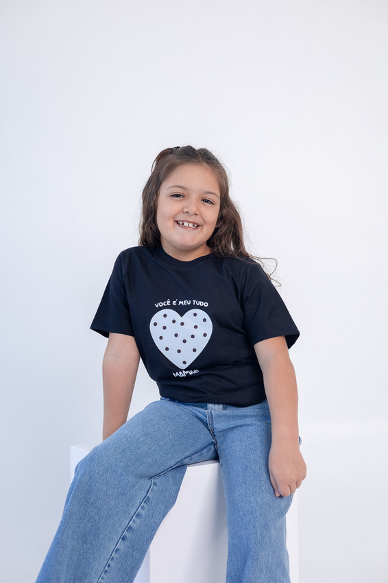 A T-shirt Infantil “Você é Meu Tudo” é puro carinho em forma de roupa! Com um visual moderno e cheio de afeto, ela traz um coração estampado com bolinhas e a frase “Você é meu tudo, mamãe” — perfeita para celebrar o amor entre mãe e filha de forma divertida e estilosa.